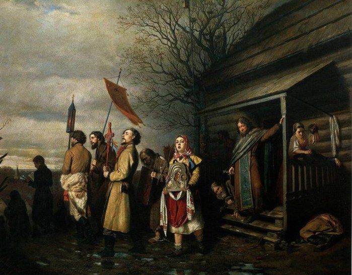 Наиболее выразительны лица пьяного священника, потерявшего человеческий образ, и молодой простоватой крестьянки со спущенными онучами. Явно захмелев, она истово поет молебен, полузакрыв глаза. Выразителен и мужичок, держащий перевернутую икону, надо понимать, тоже не совсем трезвый. Из крестьянского дома, в котором батюшка с причтом наотмечались Воскрешение Христово, предстоит нелегкий путь в церковь, виднеющуюся вдали. Судя по степени их опьянения, путь будет многотрудным… (Пелевин Ю.А. «Перов Василий Григорьевич, Сельский крестный ход на пасху»)